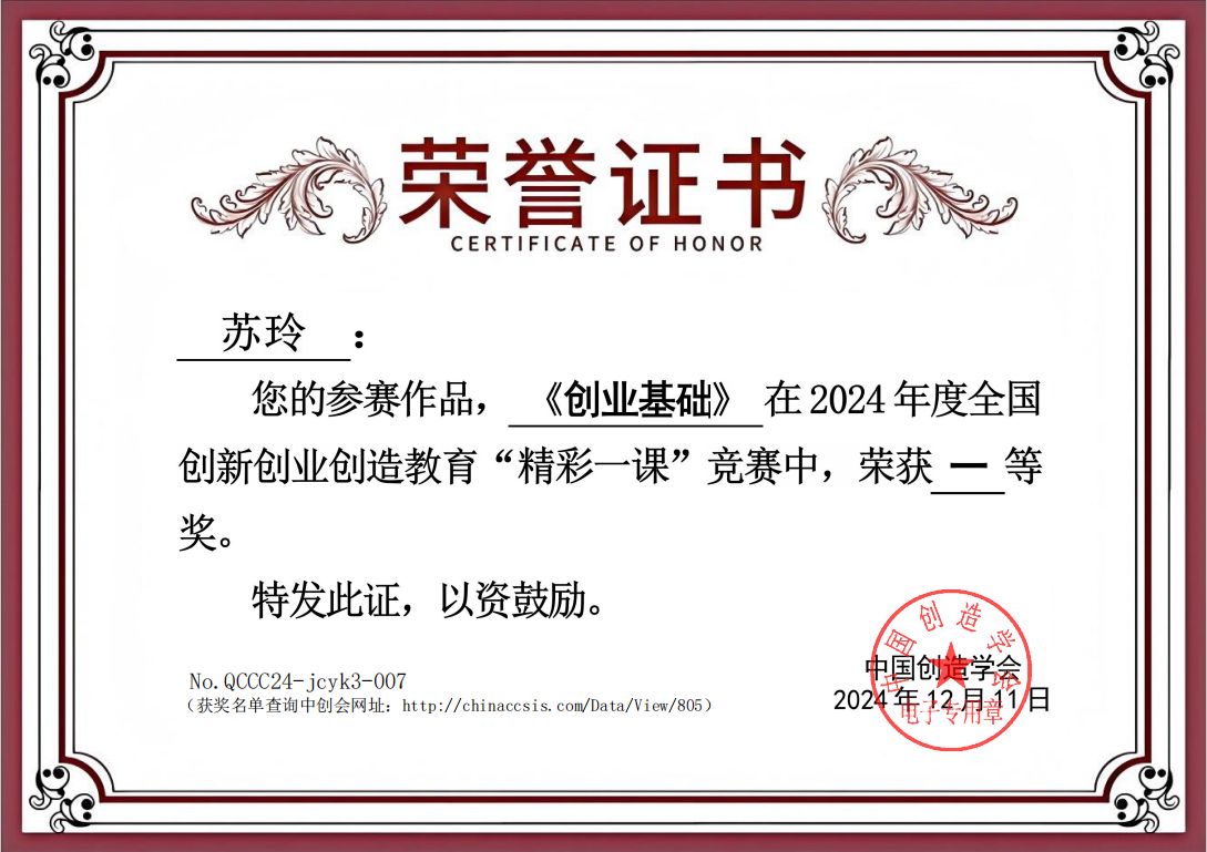 全国创新创业创造教育“精彩一课”竞赛由中国创造学会主办,中国创造学会创新创业创造专业委员会、中国创造学会创新转化分会、教育部创新创业课程群虚拟教研室(同济大学)、安徽工业大学教务处(教师教学发展中心)共同承办。该项赛事被列入了2024全国普通高校教师教学竞赛清单,并作为教学竞赛维度纳入2024版全国普通高校教师教学发展指数,旨在在进一步加强高校创新创业师资队伍建设,引导教师加强创新创业课程改革创新,提高课堂教学水平。本次比赛共有来自东南大学、东北大学、安徽工业大学等院校的92名教师参加,经过激烈比拼,我校教师在教学理念、教学内容、教学组织、教学语言与教态、教学特色等方面获得专家评委们的好评。苏玲、门金瑞、刘会芳荣获一等奖,刘建丰荣获二等奖,孔佳利、生俊青、马安佳荣获三等奖。